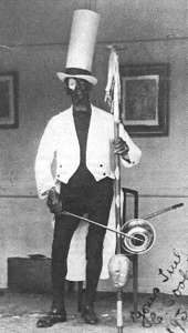 The addition of those various noise-makers suggests a kinship with the Turkish crescent, a percussion stick of more ornamental design and more formal function in military bands, but the absurdly, noisily bedecked 19th century bumbass broadly parodied the Turkish crescent's position leading marching bands in the late 18th century when Turkish 'Janissary' music spread throughout Europe. It was called the 'Jingling Johnny' in England, also the 'lagerphone' or 'boom stick' when it was regarded as a less complex rhythm instrument. (A watercolour by George Scharf from London in the 1820s depicts a one-man band wearing the top of a Jingling Johnny including the little crescent moon, on his hat; he plays panpipes fastened around his neck and beats a bass drum and tambourine slung over his shoulders).