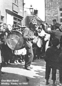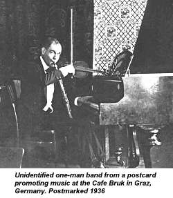 Note: I would appreciate hearing from anyone with further information (photos, descriptions, recollections, etc.) on one-man bands. This article in an initial attempt to document the history of this phenomenon. I hope in the future to expand it into a much fuller study. My address is 1622 West Sherwin, Apt. 2S, Chicago, Illinois 60S26, U.S.A.