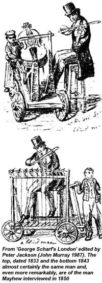 I am 55 years old. I was one of a street-band in my youth, and could make my £0.5s a week at it. I didn't like the band, for if you are steady yourself you can't get others to be steady, and so no good can be done. I next started a piano in the streets, that was 23 years ago. I bought a chaise big enough for an invalid, and having had the body removed, my piano was fitted on the springs and the axle-tree. I carried a seat, and could play the instrument either siting or standing, and so I travelled through London with it. It did pretty well; in the summer I took never less than 20s., and I have taken 40s on rare occasions, in a week, but the small takings in the winter would reduce my yearly average to 15s a-week at the utmost. I played the piano, more or less, until within these three or four years. I started the bells that I play now, as near as I can recollect, some 18 years ago. When I first played them, I had my 14 bells arranged on a rail, and tapped them with my two leather hammers held in my hands in the usual way. I thought next I could introduce some novelty into the performance. The novelty I speak of was to play the violin with the bells. I had hammers fixed on a rail, so as each bell had its particular hammer; these hammers were connected with cords to a pedal acting with a spring to bring itself up, and so, by playing the pedal with my feet, I had full command of the bells, and made them accompany the violin, so that I could give any tune almost with the power of a band. It was always my delight in my leisure moments, and is a good deal so still, to study improvements such as I have described. The bells and violin together brought me in about the same as the piano. I played the violoncello with my feet also, on a plan of my own, and the violin in my hand. I had the violoncello on a frame on the ground so arranged that I could move the bow with my foot in harmony with the violin in my hand. The last thing I have introduced is the playing four accordions with my feet. The accordions are fixed in a frame, and I make them accompany the violin. Of all my plans, the piano, and the bells and violin, did the best, and are the best still for a standard. I can only average 12s a-week take the year through, which is very little for two."