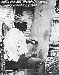 as in the case of blues singer and guitarist Lee Jackson whose first instrument as a child growing up in Arkansas in the 1920s was a piece of bailing wire strung on the side of his uncle's house - a not unusual first instrument of black children in the southern United States. A snuff bottle was worked in under the string at one end and it was played with another snuff bottle as a slide to create, in the words of Lee Jackson, those "Hawaiian sounds". In order to accompany this one-string guitar, Jackson nailed a baking powder can to the wall ...