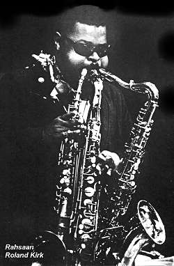 More than that, conventional forms could be stretched and the furthest explorations of the musical adventure conducted with all the dedication and accomplishment of 'serious' musical innovation. One of the most inspired one-man bands of our time must be that of Jazz musician Rahsaan Roland Kirk who sought to recreate a sound he first heard in a dream. He hung around his neck an array of flutes, whistles, bird calls, bells, castanets and hand drums. At his feet sat a bass drum, sock cymbal, gong and an assortment of horns. He could play three saxophones at once and on a solo medley such as Going Home he played Les Brown's Sentimental Journey on the mazello horn and a theme from Dvorak's New World Symphony on the tenor saxophone. As he improvised on one theme on one horn, he played an accompanying line on the other horn, and played rhythm with the sock cymbal at his feet.