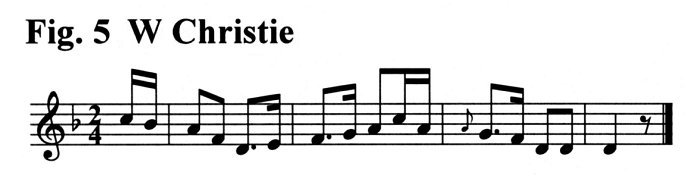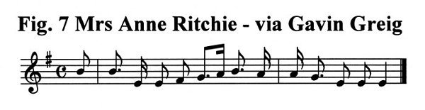 Aside from text (as it were), Joyce's tune, ABCA in form, has echoes of Greig - more properly, vice-versa. Where did Greig's versions come from? The parallels between the first set of bars is clear (Fig. 8) and one should also add that the phrasing in the second set of four bars is particularly noticeable as rising in the manner of Joyce, who may, then, represent a historical descent.