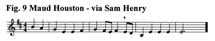 Yet, whilst the time-signature given for the tune is six-eight, the notes and the musical phrasing in the first four and the last four bars do not stand out excessively from English sung versions. The middle two sections, in contrast, do contain an extensive leap upwards. All told this still equates to an ABBA pattern as far as the first given textual stanza goes and it is akin to all the Scottish and Irish versions so far adduced.(Fig. 10)