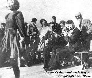 ... the music and dancing started; and while the young people played and danced the old folk sat on the wall enjoying the music, stepdancing and set-dancing; and telling stories of times they had known and things they had done. The old people were our critics, historians and custom keepers.When wintertime came, the big stoneflagged kitchens came into their own and any opportunity would be taken to hold a dance or 'soiree' as they were known locally: festivals, family celebrations (weddings alone had five different days of celebration), bereavements, ' American wakes' (especially sad occasions to mourn the departure of a friend to foreign parts - all too regular an occasion in Clare) and, often, just for the 'crack'. The Crehan house was a regular venue.1