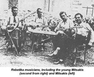 'A new craze soon was all the rage: Going to listen to the bouzouki in the typical districts where it was traditionally performed. The pioneers witnessed with amazement this earthquake. They were not able to resist for long.As Markos Dragoumis declared, in Rebitikat: 'The old genuine Rembetika music is unique ... When you hear this music, you feel that something very deep and important is taking place, that you are encountering one of the great achievements of the human heart'.It was their turn to move from their joints to go playing, for fabulous sums, to delighted mundane audiences. The old melodies soon mixed with the smell of kebabs and retsina'.