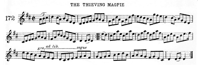 A similar setting from Ireland with a distinctive ending to the second strain, was published by Francis Roche as the Thieving Magpie.