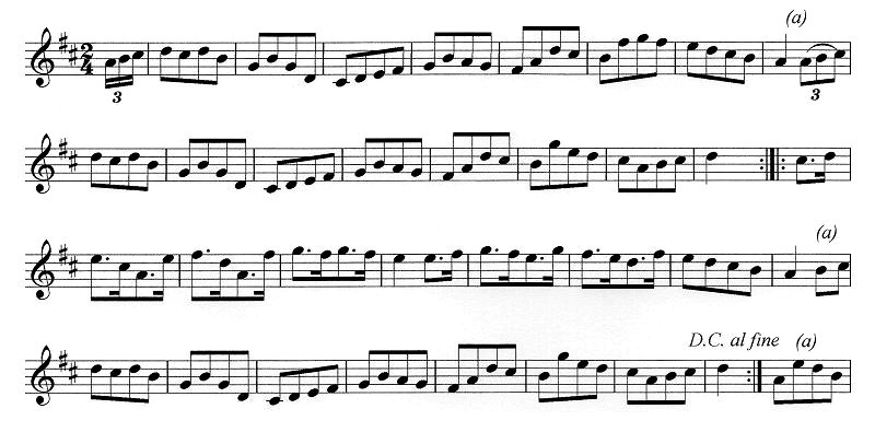 21. The remainder being in 2/4: the settings in the Lister, Moore and Winship manuscript are notated in 4/4, but with a time signature - a C with a line through it - indicating cut-time - 2/2).