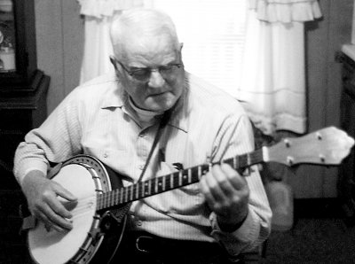 Wash was about ninety-three when we recorded him and had just survived a dreadful house fire. Nonetheless, he talked and sang virtually nonstop for a period of several hours. He was a vivid storyteller and told many tales of a rugged pioneer life. These were a bit disconcerting, because sometimes he would describe himself as a devout Christian penitent and sometimes as a thuggish near-outlaw. Which presentation was accurate? Well, probably a mix of the two. At one point in his life, he had sung in medicine shows. He told us that you could sing anything one wanted at those, including old ballads like The House Carpenter, but he indicated that Groundhog represented a particularly effective comic favorite. Wash no longer owned a banjo but I happened to have one along. Groundhog is a justly popular banjo tune, with many fine recordings (Jack Reedy; Morgan Sexton; Arnold and Doc Watson; Cousin Emmy on the Berea College Library website), but Wash's older, minor key setting is less common (the banjo is probably tuned gDGCD).