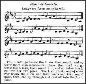 The only one of the numerous old English dances which has retained its popularity until the present day, is probably a tune of north-country origin. Mr. Chappell (Popular Music, vol. ii.) says that he possesses a MS. version of it called Old Roger of Coverlay for evermore, a Lancashire Hornpipe, and in The First and Second division Violin (in the British Museum Catalogue attributed to John Eccles, and dated 1705) another version of it is entitled Roger of Coverly the true Cheisere way.