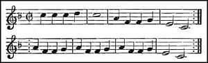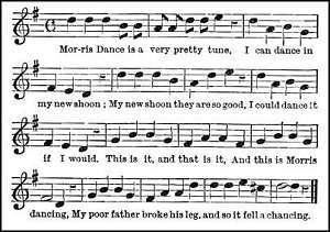 In Yorkshire the dancers wore peculiar head-dresses made of laths covered with ribbons, and were remarkable for their skill in dancing the sword dance over two swords placed crosswise on the ground. A country dance which goes by the name of the Morris Dance is still frently danced in the north of England. It is danced by an indefinite number of couples, standing opposite to one another, as in Sir Roger de Coverley. Each couple holds a ribbon between them, under which the dancers pass in the course of the dance. In Cheshire the tune (shown above, left) is played for the Morris dance.