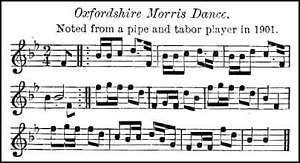 In Oxfordshire there are Morris dancers who perform to the music of a pipe and tabor. The following tune (left) was noted down by the present writer from a pipe and tabor player, as one used for the Morris dance in an Oxfordshire village.