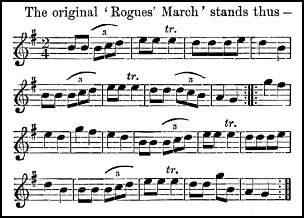 Originally a military quickstep, which for some cause has become appropriate to use when offenders are drummed out of the army. When, from theft, or other crime, it is decided to expel a man from the regiment, the buttons bearing the regimental number, and other special decorations, are cut from his coat, and he is then marched, to the music of drums and fifes playing The Rogues' March,