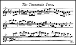 To the above it may be added that a curious account of the cure of a person bitten by the tarantula spider is given, in a letter signed Stephen Storace (the father of the better-known musician), in The Gentleman's Magazine, for Sept, 1753. Storace says that he was called upon to play the particular tune associated with the cure, but this he did not know, and tried sundry jigs without effect, until learning the proper tune from the lips of an old woman he played it with a satisfactory result. He gives the following (right) as the traditionary melody, and states that the scene of the occurrence was a village ten miles from Naples.