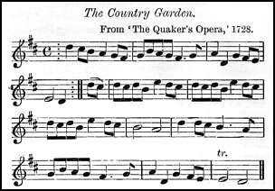 and is also the same as the tune The Country Garden printed as the air for a song in the Quaker's Opera, 1728. This is also used in other ballad operas.