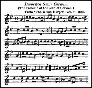 In the early years of the 19th century it seems to have been recognised that apart from the published Welsh tunes, a number of traditional Welsh melodies yet existed among the people, and at local eisteddfodau, prizes were offered for MS. collections of these. Though no attempt at publication was made, one or two of these MS. collections fortunately still exist; John Parry, the later, having used one for material for his Welsh Harper. Miss Maria Jane Williams collected folk-tunes in South Wales, and in 1838 submitted her collection at an eisteddfod. She, however did more, and a selection of forty-three of them was published in 1844. Her collection is now extremely rare, and only a small number of copies can have been issued. She noted a number of modal tunes, and had the true instinct of a modern folk-song collector, being distinctly in advance of her time in the appreciation of pure folk melody. Her collecting was done in Glamorganshire. It was not until 1896 that a further book of traditional Welsh folk melodies was published. The late Mr. Nicholas Bennett in that year issued Alawon fy Ngwled, or Lays of my Land. This has over 400 melodies, without words from traditional sources, though, as might be expected, there are in it a number of English folk-tunes, and some published English and other airs not folk tunes; it is, however, an honest attempt at a much-needed work. Carl Engel, in his Literature of National Music (1879), drew attention to the desirability of searching Wales for traditional melodies, and he prints an air, Dixon's Hornpipe, noted by himself at Llangollen, claiming it to be 'as fine as any of the finest Welsh tunes in popular favour'.