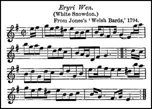 In Jones's first edition of Musical and Poetical Relicks of the Welsh Bards (1784) is included Captain Morgan's March, The Dimpled Cheek, The Bend of the Little Horseshoe, Winifreda, Ar hyd y nos,Dafyddy Garreg When, Pen Rhaw, etc. In the 1794 edition the whole plates are reprinted, with additions, and for the first time. Men of Harlech with other now popular airs, sees the light for the first time. Among these is the following Eryri Wen (White Snowdon) from Jones's Welsh Bards (1794).