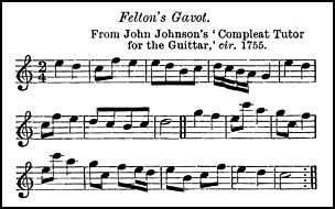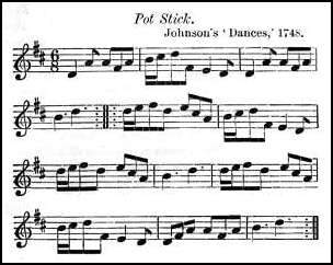 The earliest copy of the melody the present writer has seen is in John Johnson's Collection of 200 Country Dances, vol. iv., 1748, where it appears under the title Pot Stick, as follows. This tune has nothing in common with two airs named, respectively, Potstick and Irish Potstick in Oswald's Caledonian Pocket Comanion, of a little later date than Johnson's Dances.