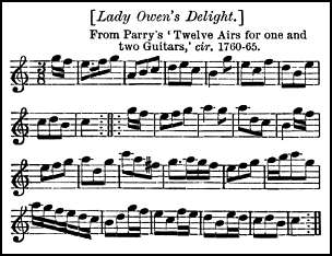 Parry had inserted it in his first Welsh collection, 1809, and there states that he is unable to trace its origin. Blind Parry's first collection of twenty-four 'Arias', unamed, includes Lady Owen's Delight, which is again repeated without name in his later collection of Twelve Airs for one and two Guitars (c. 1760-65). In his 1781 edition it first bears the name Difyswch Arglwyddes Owen's.