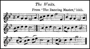 II. The name was also applied to pieces of music supposed to have been played or sung by the Waits of particular towns or cities, as especially associated with these places. Thus we get London Waits, Chester Waits, Colchester Waits, Worksop Waits, Oxford Waits, Bristol Waits, York Waits, and so on. Many of these are preserved in 17th and 18th century country dance-books, the earliest specimen in print known to the writer being one named The Waits in the 3rd edition of the Dancing Master, 1665, among the tunes at the end.