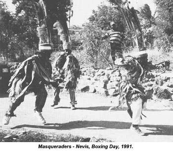 We discovered that, with the exception of Black Dan, it was very difficult to get to talk to any of the performers. There is an assumption that if you are white you are an American and therefore a rich tourist, and it was difficult to overcome this. We suspect that even Black Dan did not think that we were seriously interested in the events taking place, although we showed him photographs of English Pace Eggers and North West Morris Dancers. However, we did not encounter any hostility, although our friend who had seen the Masqueraders previously in the north of St Kitts was told in no uncertain terms that he had watched enough. In this country when watching traditional events we like to try and keep to the back of the crowd and not be too obtrusive - this approach does not work so well when you are the only strangers in a small audience.