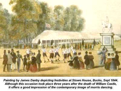 [The final sentence here refers to a painting by John Cheney in 1840 - oil on canvas, approximately 7 x 11 inches - which now hangs in Banbury Museum. A handwritten sheet of paper slipped into the frame alcove at the rear of the canvas - the text of which immediately follows this note - states, however, that the artist was Joseph Scarcebrook. Prior to Castle's death, Cheney - a local printer - had an engraving made of the painted image, and printed copies for sale, and perhaps the engraving was the work of Scarcebrook. Another source - see below - ascribes the painting to one Mr. Levy. Janet Blunt of Adderbury possessed a copy of the lithograph, which she sent to Cecil Sharp (source 14). It is reproduced here. On Monday, 28 April 1986 I interviewed Frederick and Winifred G. Wyatt in their home at Adderbury. She had been maid to Janet Blunt, and after her death had rescued the manuscripts relating to dance and song collected by Blunt during the first quarter of the twentieth century - before relatives burned everything they considered worthless - and posted them directly to the English Folk Dance and Song Society in London. She showed me an original painting - on wood, about 9 x 12 inches, lacquered and fading with age into an overall brown, and very similar to the copy in Banbury Museum - on which the lithograph Blunt sent to Sharp was based. On the rear of the painting, in Blunt's handwriting, was the legend: 'This picture was given to Miss Janet H Blunt of Adderbury Manor. Oxon by Mrs Joseph Welch senior of West Adderbury...Old Metal was the fool of the Morris [illegible word] side in which William Walton. His [illegible word] was George Castle.']
