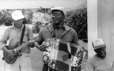 The rest of the band, for that matter, is all rhythm: Egbert Beltran plays the jawbone of an ass and the brake drum of a car, beating it with a metal stick. Ruben Flores beats on the mahogany 'Boom and Chime' drum; one side with a mallet - the boom side - and the other with a drum sack - the chime side. Mr Peters' son, Wilfrid Peters Jr, plays tumbas, which outside Belize are usually called congas. Samuel Myvett pounds away on banjo and relative newcomer to the band, Lennox Blades, plays electric guitar. Lennox replaced Allie Staine who, according to Mr Peters, wasn't holding his rum like he used to. This is soulful, up-tempo, traditional dance music that puts techno and computer driven dance music to shame. When Mr Peters starts to play, it' s simply amazing to watch everyone get up immediately and start dancing.
