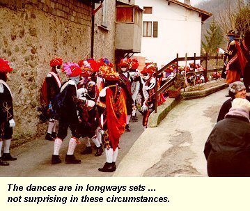 So, it is possible to construct some sort of picture of the development of this extraordinary musical corpus; a picture within which archaic structures like processional and circle dances have been conditioned by renaissance melodies, by a partly homogenous group of song tunes and by the influence of the wealthy Carnevale di Venezia. This latter influence facilitated the introduction of the great tradition of country dances with their countless variety of figures, together with the dramas, exchanges and intrigues of 16th and 17th century Venetian life which, even today, contribute to the wealthy sumptuousness of the Bagolino carnevale. Due to the changed social circumstances of the late 20th century, this grandiosity was bound to become more and more ritualised and enigmatic, fixed as it is in a tradition which has, in the recent past, become more cohesive in choreographic and musical terms.