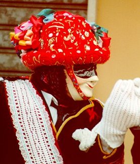 Their faces are concealed by whole-face masks which serve to impersonalise and disguise the dancers. Still handmade by many of them today, the masks are made of cloth stiffened with plaster, lined with wax to make them flexible, and painted ivory white with a black domino eye-mask (bautta) and red lips - sometimes the cheeks are reddened, particularly for the 'female' figura.