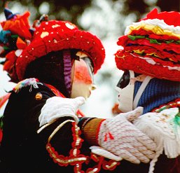 The Masked (i màscher) - On Shrove Tuesday, beside the smart ritual role of the official Compagnia, the unbridled and riotous carnival of 'The Masked', (rich in symbolic meanings, often openly erotic), trails through the streets. Boys and girls, men and women, are disguised in old traditional clothes, often of the opposite sex to the wearer. Their faces are hidden by grotesque masks and their voices are altered. They portray scenes of country life and play unsophisticated jokes - usually involving sexual innuendo and large quantities of confetti or onion skins - mainly on un-masked passers-by. This aspect of the carnevale is much more prevalent in Bagolino, where virtually the entire local population, and a good proportion of the visitors, are màschere.