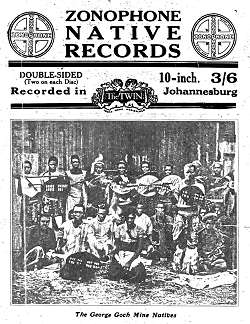 Two Zonophone export lines that concern this discussion were launched in May 1912: the general overseas 3000 series, and a 4000 series for the South African market. The latter is of immediate interest in that it reissued 'Gramophone' recordings made by a group of Swazi chiefs on a visit to London (c. late 1907-early 1908). In March- April 1912, Zonophone had also sent a recording engineer (G. W. Dillnutt) on a field expedition to South Africa. He obtained recordings in Afrikaans and in a variety of African styles. On release, the African performances were advertised as 'Zonophone Native Records'. They had been recorded in Johannesburg and included folk tales in 'M'xosa' by anonymous performers, items by the Abonwabisi Party (Don't Worry Entertainers), hymns by the Salvation Army Johannesburg 'Impi to Sindiso', and humorous and other material from the St Cyprian's Choir, H Selby-Mismang, and J B Masole. The George Goch Mine Natives sang in' Shangaan' and 'M'chopi'. In 'M'chopi' they were accompanied by 'native piano' (or mbira). Other languages represented in these recordings were 'Sechoana', 'Sesotho', 'Swazi' and 'Zulu'.