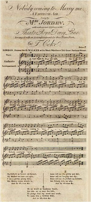 Given the somewhat tangled history of the printed pieces, there is still more information that underlines the popularity of the 'marry' version in performance. Dorothy Jordan is known through attribution on copy (in the Bodleian archive) to have sung Laurie's and Whittle's 'Marry' version of August 1806 at the Theatre Royal Drury Lane 'with unbounded applause'. Also in 1806 the Morning Post noted a performance at The Royal, Haymarket of ' "Nobody coming to Marry Me," by a Miss Tyrer...'