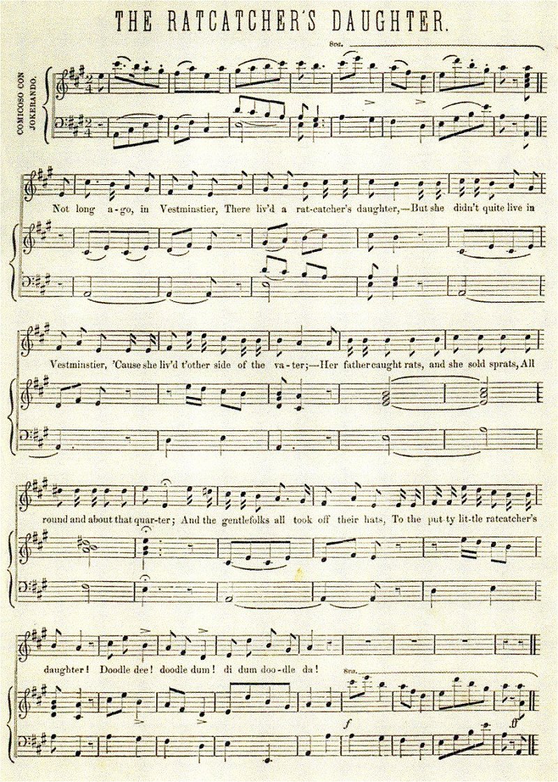 But broadside history helps us to focus on how The Ratcatcher's Daughter developed from a relatively straightforward narrative into a performance-related piece as part of an entertainment characteristic of nineteenth century theatre (the Astley's syndrome as discussed in previous MT pieces), eventually coalescing as music-hall. Misfortunately, there is no corroborating sign of it as a performance piece in those newspapers available to this writer. This may well reflect its character as being unacceptable to the fashionable palate at the time; but commentators, as already seen, attest to its popularity in a wider social context.