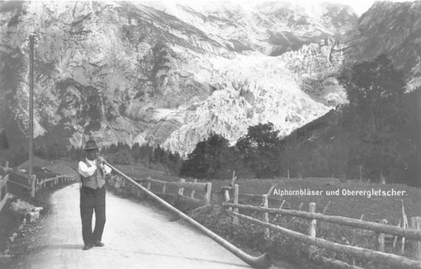 Alpenhorn player and glacier. A Swiss, Lausanne, commercial postcard.From the Bill Dean-Myatt Collection.