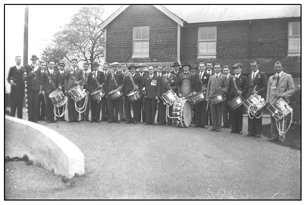 Provenance not known. Is this a British Legion Band in the 1950s in Sussex (judging by the tiles on the façade)?
