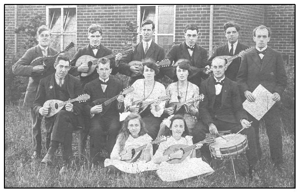 A mixed mandolin band with a snare drummer, and the leader (?) with a book of music.Provenance not known, dated in handwriting on the back, Christmas 1921. A private photograph. From the Reg Hall Collection.