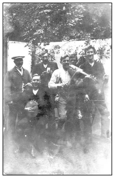 Group of men with banjo, tambourine, home-made fiddle and home-made cello, the first three, at least, seem to know how to play.