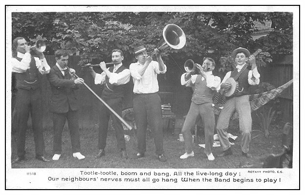 The banjo player seems to be a real musician, but the rest are codding. Is this a studio mock-up rather than an active comedy band?