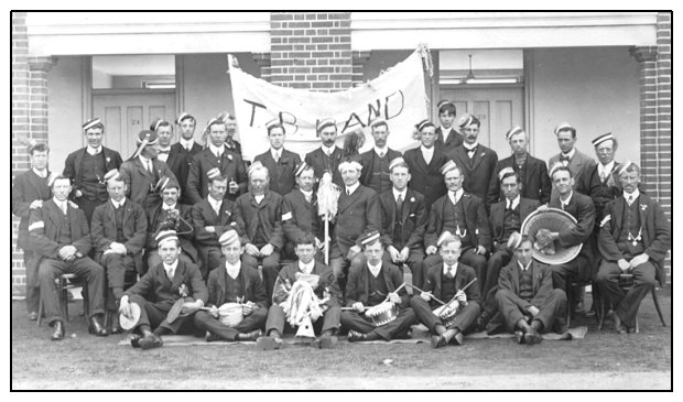 The T. B. Band. A group of men of all ages in lounge suits and pill-box hats, two with corporals' stripes, with a leader in a fancy hat holding some sort of decorated mace and a man sitting in the front holding his fancy headgear.