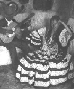 The other five titles from southern Spain are by an Andalucian cuadro gitano led by "La Coja", who was described in Walter Starkie's Don Gypsy (1936) as looking like an English nanny, but capable of terrorising her troupe when a row broke out. The cuadro is accompanied by mandolin, guitar, castanets, and tambourine, and given that these are unequivocally records of dancing, not just of dance music, one is again impressed by the way the engineers have captured what is sometimes a hailstorm of percussive sounds with such clarity. Once or twice, indeed, the recording medium is defeated, and the guitar work is reduced to a rhythmic buzzing, but in fact this ominous, bee-like drone seems quite appropriate to such wild and aggressive music. Rodney Gallop's review slightly flattered his Gramophone readership by implicitly including them in the "most people (who) would rather go further from the beaten track for their Flamenco singing and dancing." In 1938, when he was writing, these were the only cuadro flamenco recordings available, but even today, when flamenco is all too easily heard, usually in debased and clichéd touristic presentations, La Coja's team still sounds immensely exciting.