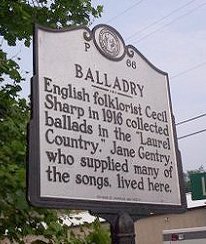 There was even a newly erected sign in the small town of Hot Springs, which bore the legend: Balladry. English folklorist Cecil Sharp in 1916 collected ballads in the "Laurel Country". Jane Gentry, who supplied many of the songs, lived here.
